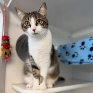 Hello, I’m Miss Stevie-ous! I’m a fun-loving, two year old, energetic cat who loves to play and explore. My curiosity knows no bounds, and I’m always up for a good laugh. I’m smart, too, figuring out puzzles and games with ease. I’m also a big fan of TV, especially nature shows – they’re my favorite! I’m not much for being picked up, but I’m a loyal companion who loves to cuddle and keep you company. I’m a little goofy at times, but that’s part of my charm. Adopt me, and I promise to bring lots of laughter and love to your life! I have potential to live with dogs with slow proper introductions.