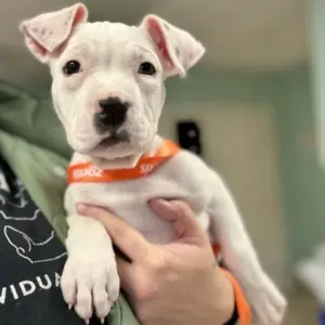 Hi there! I’m just a tiny 2-month-old pittie pup with a big heart and an even bigger personality. I may be small now, but I’ve got dreams as big as my ears – and oh, did I mention I’m deaf? Don’t worry, though – I don’t let that slow me down one bit! I’m all white with the cutest little black mustache spot (I like to think it makes me look extra sophisticated… or at least very kissable). I love to play, snuggle, explore, and learn – and I’m already figuring out how to understand the world in my own special way. Being deaf just means I’ll need a family who’s ready to help me learn using hand signals, patience, and lots of love. In return, I promise to be your most loyal, wiggly, mustache-wearing sidekick ever. Come meet me – I’ve got a whole lifetime of love and tail wags to give!