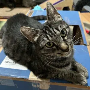 Shayne is a grey tabby, spayed, rabies vaccinated, and combo tested negative. She has a head tilt that doesn’t seem to bother her or cause her pain and the vet did nit find anything wrong. She is friendly, rubs against your leg and wants pets! Shayne talks a little but haven’t seen her play with any toys. She was a good mom and raised her kittens. Now it is time she gets to be someone’s indoor kitty.