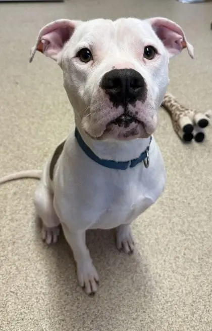 I’m a 3-year-old pitbull boy with a soft white coat and a few handsome brown spots that make me one of a kind! I came to the shelter a little too skinny, but I’m already learning that regular meals and kind people make life pretty amazing.