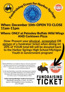 Stop out to either Buffalo Wild Wind or CorkTown Pizza in Petoskey to help support Harbor Springs Michigan Youth in Government program. Just show them your Fundraising Ticket that is attached here while dining in, and they will donate 20% of your total bill to the Harbor Springs Michigan Youth in Government.